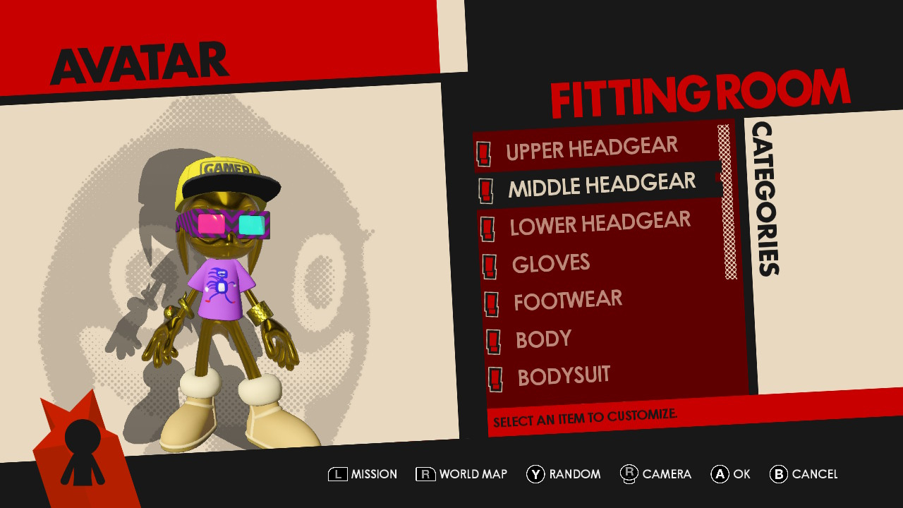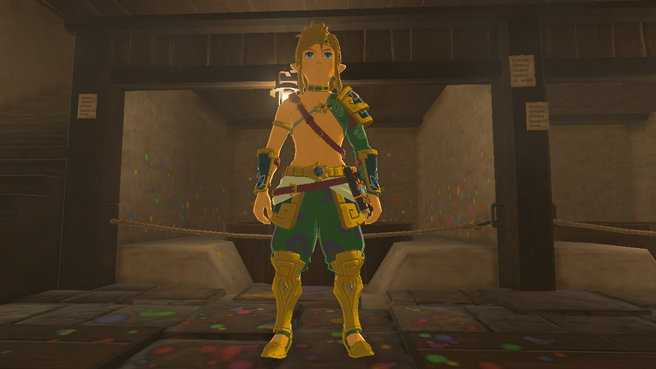 A character dressed in green and gold armor stands in a rustic indoor setting with confetti on the floor and walls